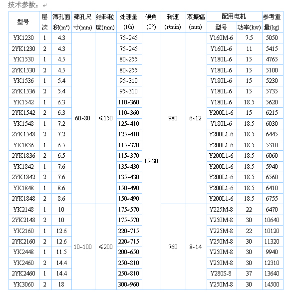 1、YK型塊偏心圓振動篩系YA型軸偏心圓振動篩的更新?lián)Q代產(chǎn)品,有20個定型規(guī)格并分別有敞開型和封閉型兩種結構形式。本系列振動篩有輕型和重型之分,適用不同物料粒度級別的篩分,選用時請確定電壓制式及有無防爆要求;
