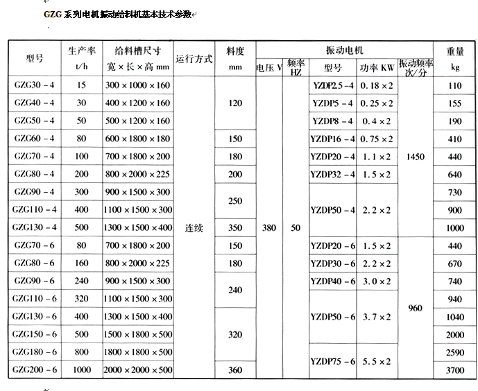 GZG系列電機(jī)振動給料機(jī)基本技術(shù)參數(shù)